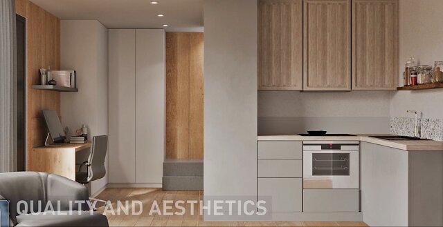 Los servicios de este proyecto están especialmente diseñados para satisfacer las necesidades y deseos de un público joven, incluyendo una cafetería-restaurante en la planta baja. En 2-3 minutos, los residentes de este edificio ultramoderno podrán llegar a una plétora de tiendas, a la bahía de Marina Zeas, al teatro municipal y, por supuesto, a una estación de tranvía y metro.